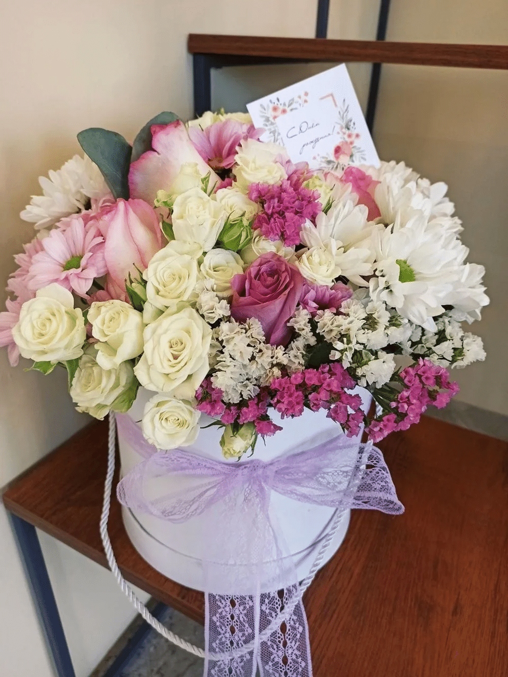 Букет состоит из белых ромашковидных хризантем, нежно-розовых и насыщенных бордовых роз