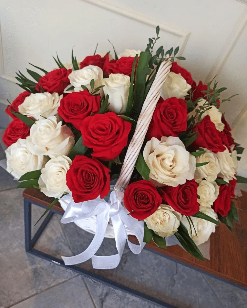 Композиция состоит из свежих красных и белых роз с добавлением зелени