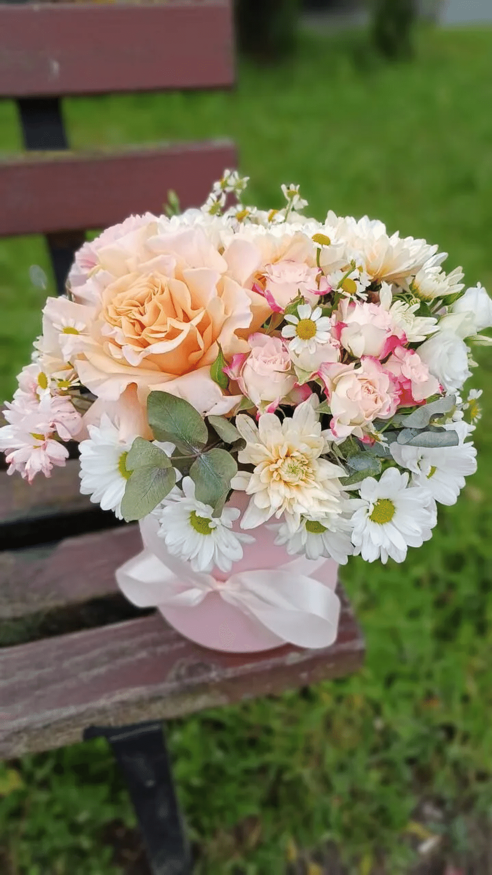Букет включает в себя крупные персиковые розы, белые ромашки, мелкие кустовые розы и декоративную зелень (эвкалипт)