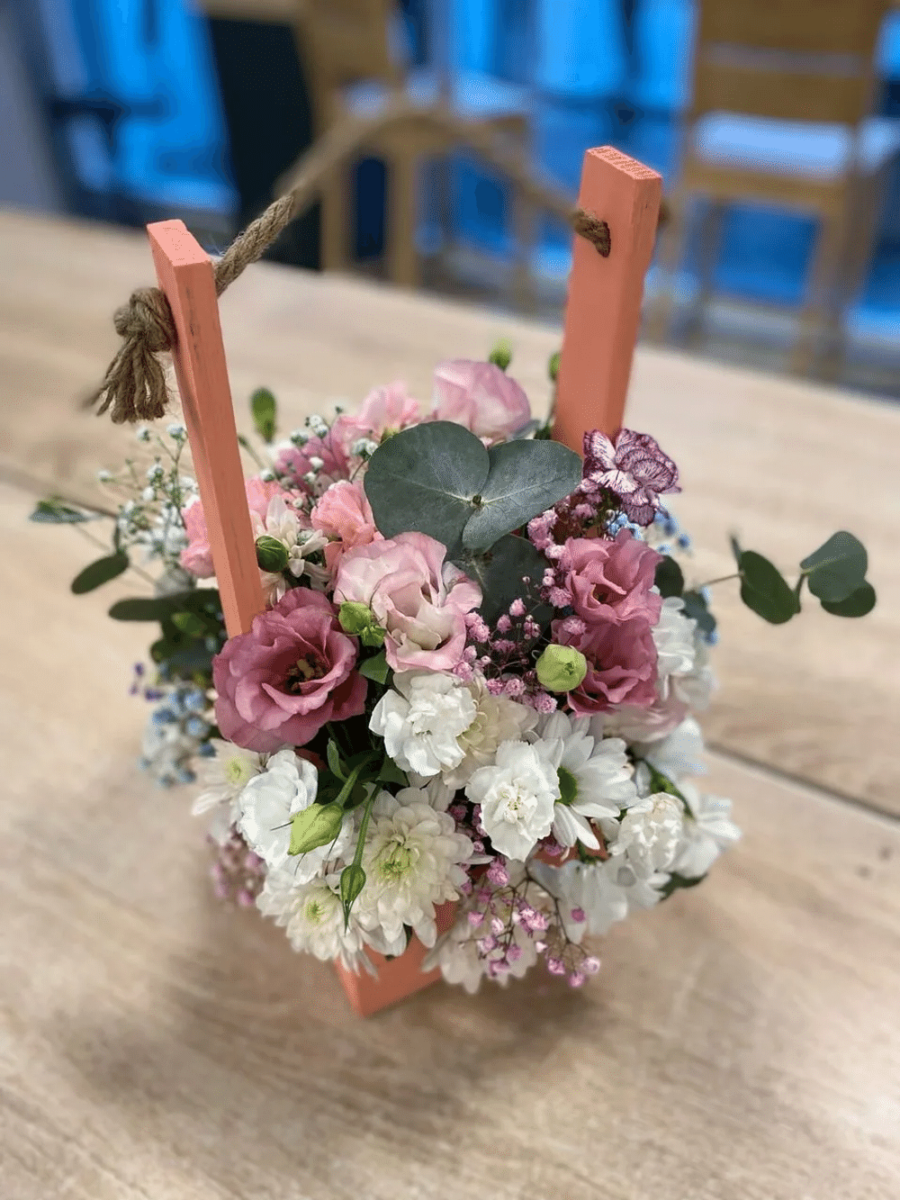 цветочная композиция в деревянном декоративном кашпо с ручкой