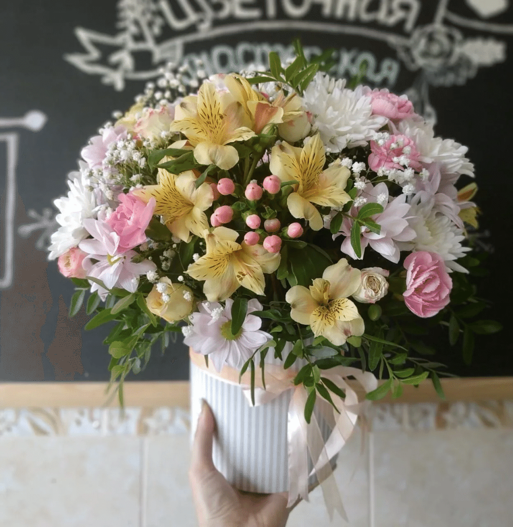 Композиция состоит из розовых кустовых роз, белых кустовых хризантем и желтой альстромерии