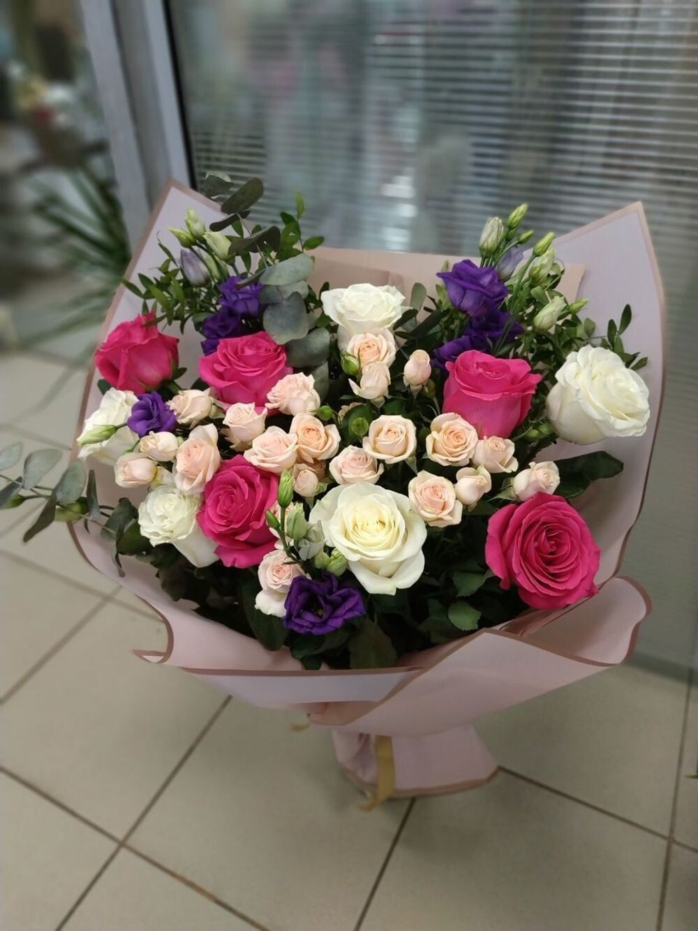 Розы различных оттенков (розовых, белых, фуксии)