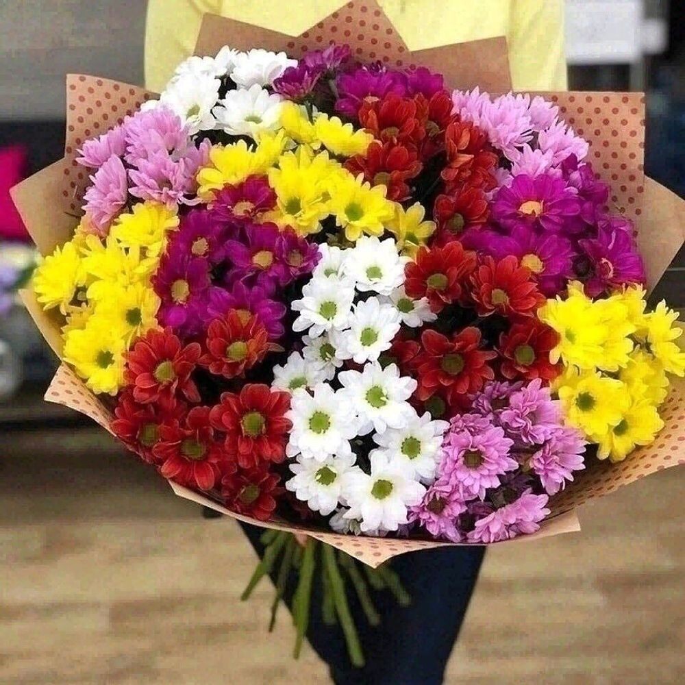 Разноцветные хризантемы, завернутые в крафтовую бумагу