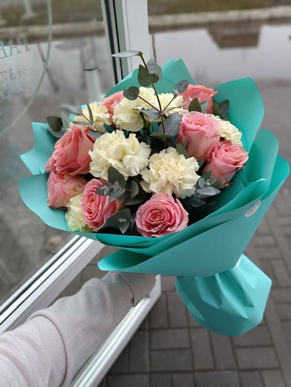 Изысканный букет цветов, состоящий из розовых роз, белых гвоздик и веточек эвкалипта