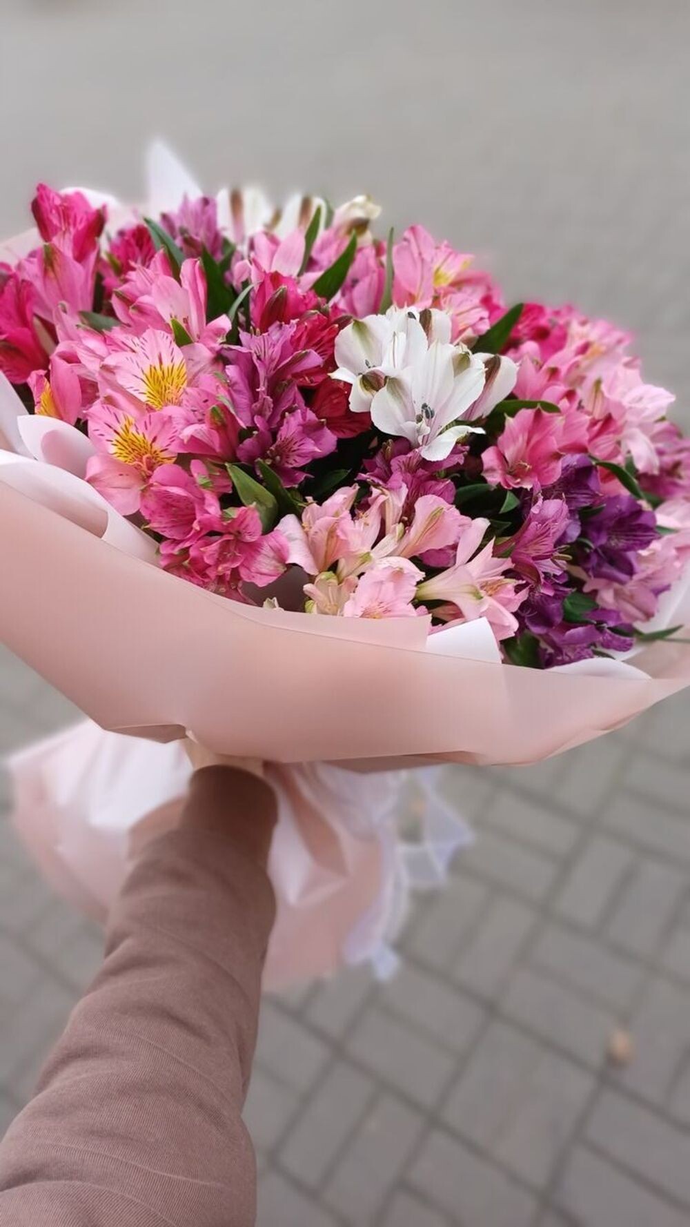 Розовые и малиновые альстромерии, дополненные белыми цветами