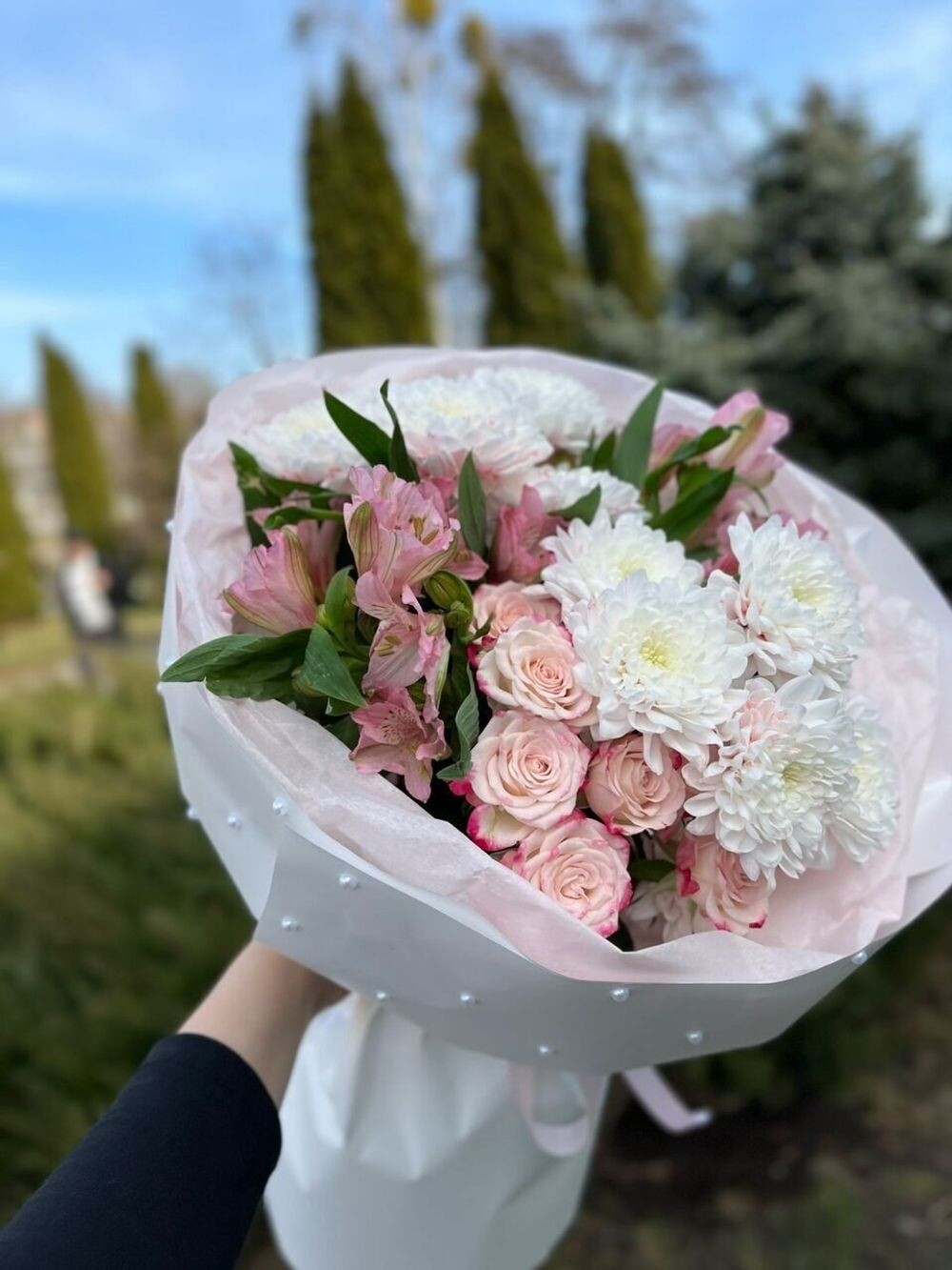 Букет цветов, состоящий из белых хризантем, нежно-розовых роз и альстромерий