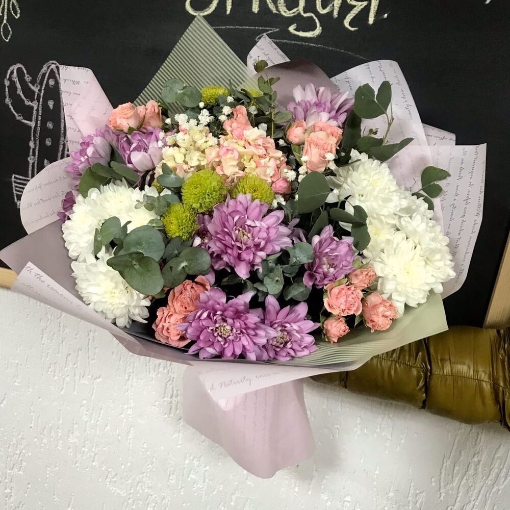 Хризантемы, гвоздики, эвкалипт