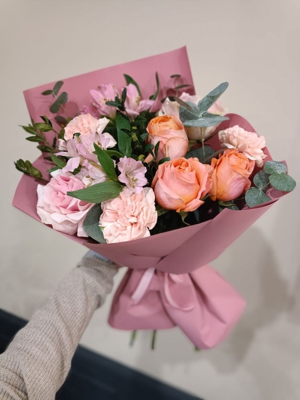 Нежный букет цветов, состоящий из пионовидных роз, кустовых роз и эвкалипта