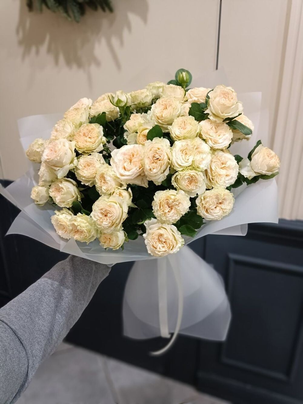 Пышный букет кремовых кустовых роз