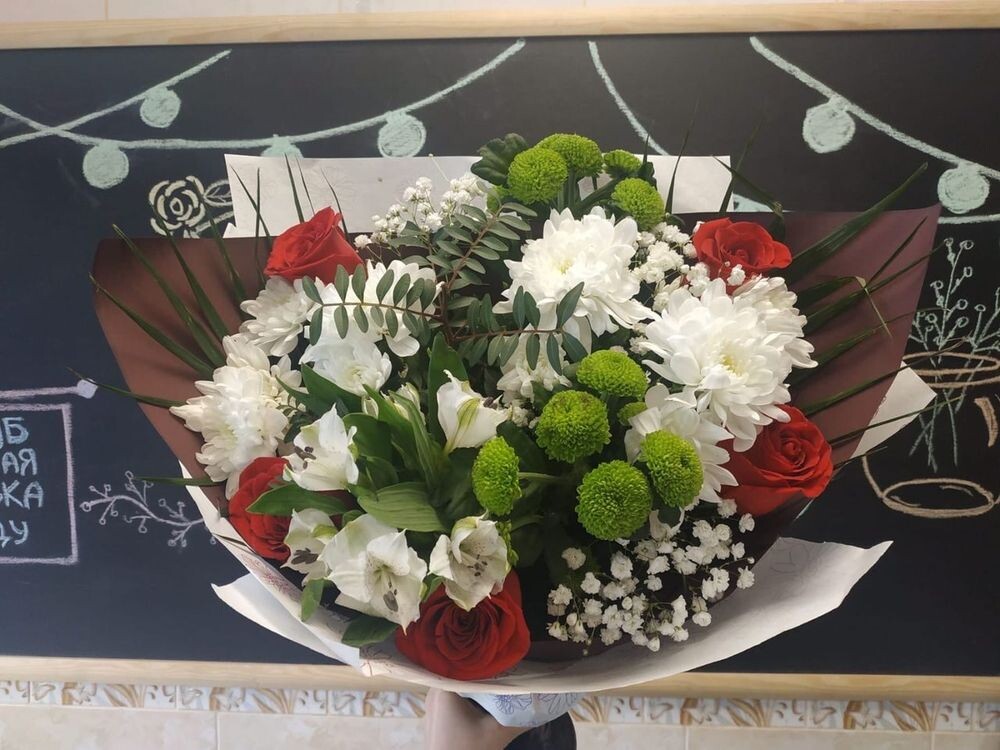 Красные розы, белые хризантемы, зеленые хризантемы, гипсофила и зелень