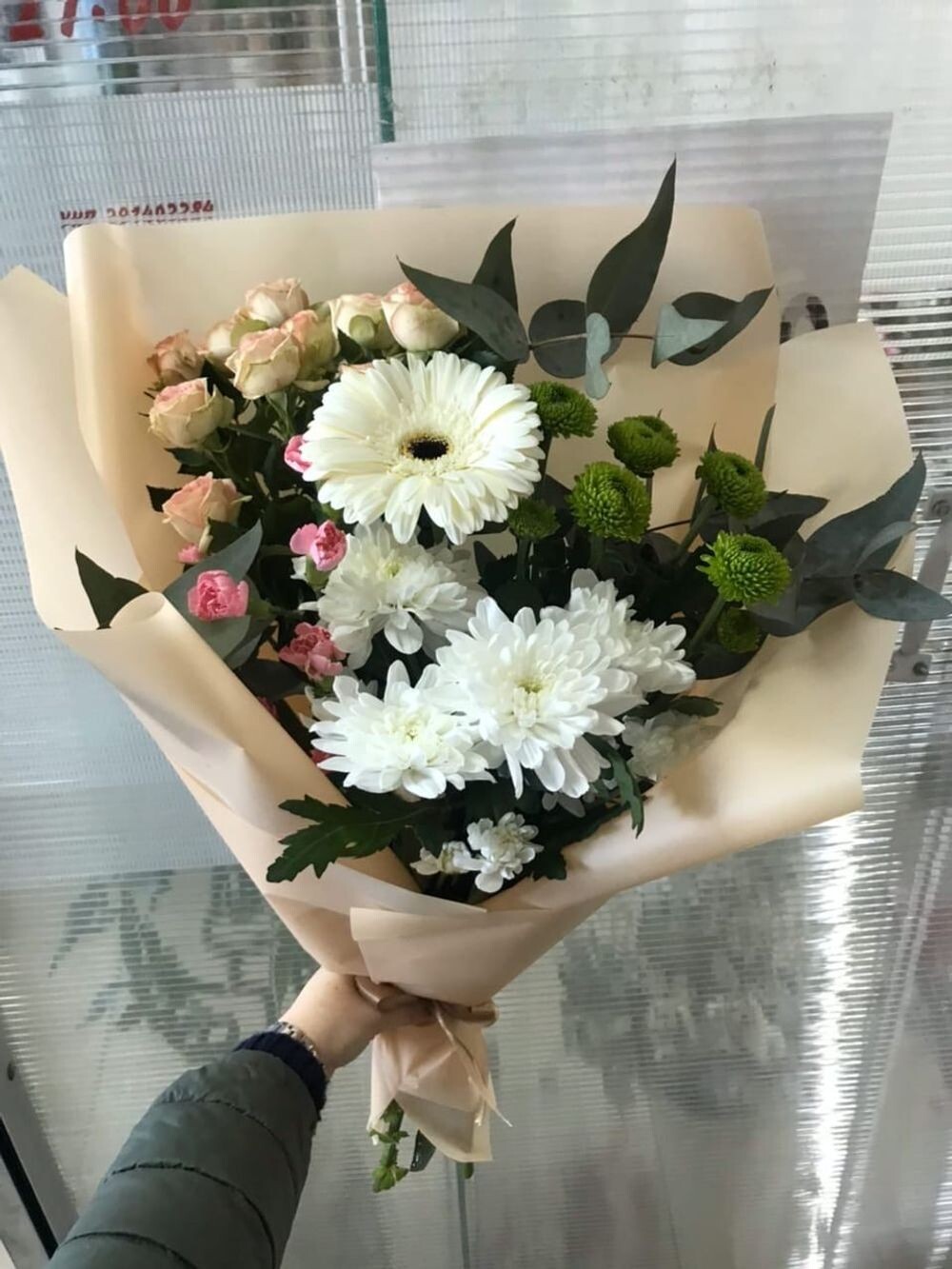 Букет состоит из белых гербер, светлых роз, хризантем и зелени (эвкалипт)