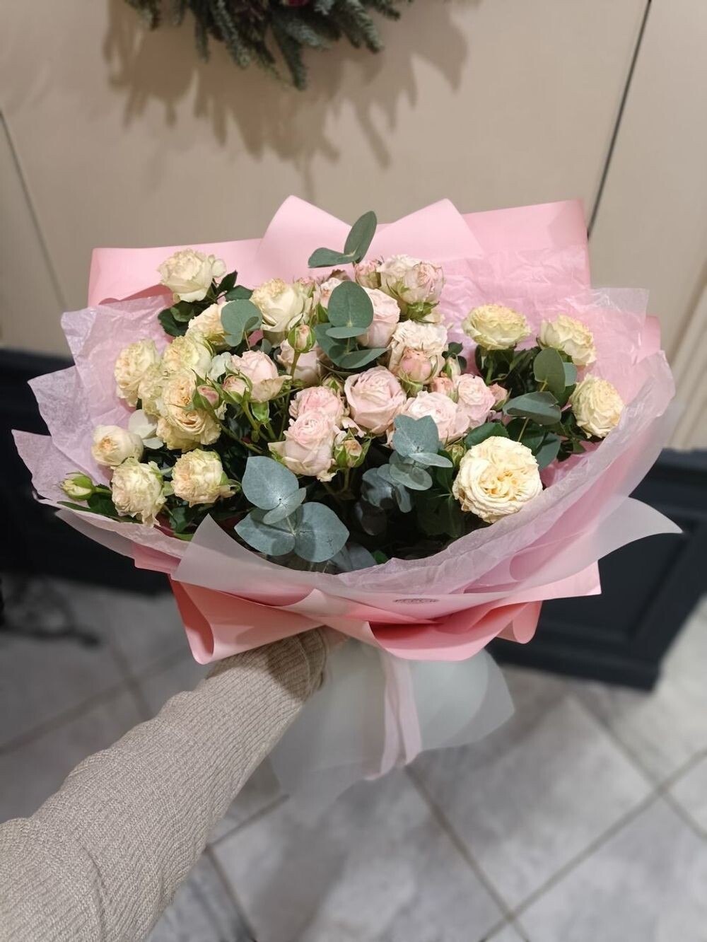 Кустовые розы кремового оттенка, веточки эвкалипта